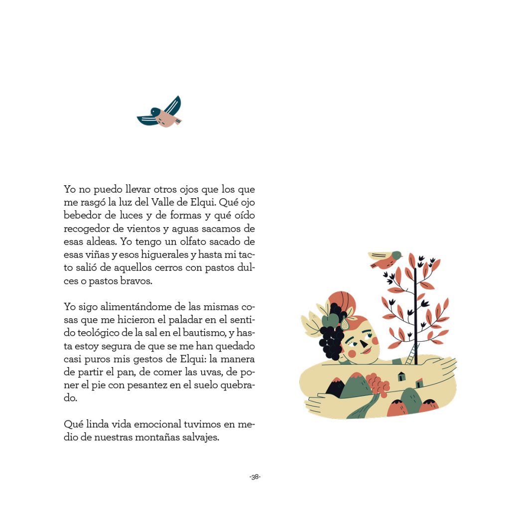 “Jaime Quezada nos regala en esta preciosa y delicada compilación de la memoria de Gabriela Mistral y de su ‘cuchillada más estrecha’, el Valle de Elqui, un escenario de lo sensible, que nos conmueve en su corporalidad y en la densidad de sus signos”, señala Sonia Montecinos en el Epílogo del libro. Tres son las temáticas principales de la selección que nos ofrece Quezada, el territorio natal-patrio-elquino; los cielos que enmarcan la mirada y, el regocijo de compartir mesa y casa. La edición que ofrecemos cuenta con el hermoso trabajo de ilustración de Camipepe, jóvenes ilustradores de La Serena.