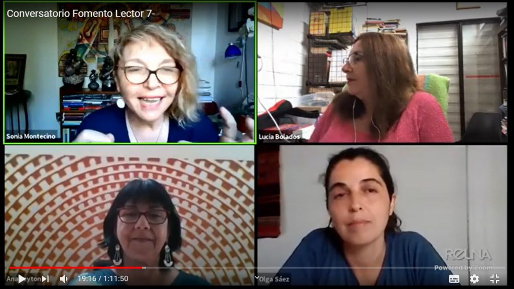 Conversación con las panelistas estables Olga Sáez (profesional Editorial ULS, diplomada en mediación cultural y fomento lector) y Lucía Bolados (Corporación Municipal Gabriel González Videla) y las invitadas Sonia Montecinos (Antropóloga, escritora, académica y doctora en Antropología) y Ana Leyton (profesora, escritora y directora del Centro Cultural del Choapa de Illapel).