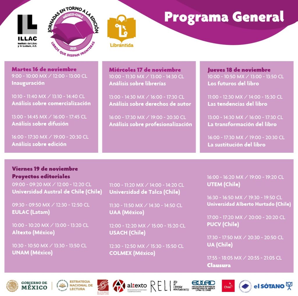 Organizadas por Instituto del Libro y la Lectura, A.C. (ILLAC), cuyo objetivo general es realizar y fomentar la investigación, la docencia y la difusión en materia de las ciencias del libro y de los procesos y hábitos de lectura, se desarrollaron durante noviembre una serie de conversatorios virtuales denominados “Jornadas en torno a la edición, México-Chile 2021: Libros que disipan fronteras”.